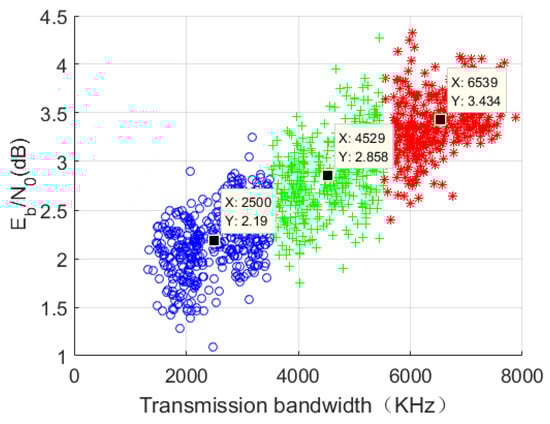 The traditional ACM technology selects the corresponding modulation and coding schemes according to the threshold calculated by the CSI fed back from the receiver, which depends largely on the assumed channel model [,]. In fact, the real channel is not Gaussian-distributed; the amplifier incurs nonlinear effects, etc. Using the traditional ACM algorithm, it is often difficult to meet the frame error rate (FER) requirement [,]. With the rise of machine learning algorithms, more simple and effective methods are used to reduce the complexity of the traditional methods [,,]. The clustering algorithm is an important unsupervised learning algorithm in machine learning. Due to its flexibility, it is widely used in various technical fields [,].
