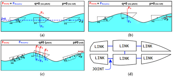 Figure 3d). This subdivision also improves the inertial momentum of the boat’s hull since each part may be in different wave heights, submerged hull volume, and buoyancy forces. These individual forces under each part of the hull are combined by the Gazebo’s physics engine, allowing the torque to be estimated. The resulting effect of the gravity (red arrow) and buoyancy (blue arrow) forces is depicted in