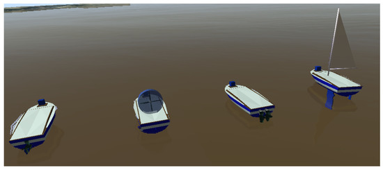 Figure 4, are integrated into the proposed simulator as default in order to describe different dynamics of USV: an airboat, a motorized boat with one rudder, a differential boat with two thrusters, and a sailboat. The airboat uses a fan above the surface of the water as a propeller. This fan also rotates on its own axis to change the airboat direction of movement. The airboat suffers more from the effect of drift (sideslip angle) since it does not have any foil underwater. The motorized boat uses an underwater thruster for propulsion and a rudder for changing the movement direction. The differential boat uses two underwater thrusters, which enables the rotation over its axis. The sailboat uses a rigid sail for propulsion, a rudder for changing the movement direction, and it also has a keel to help with sway and roll stability.
