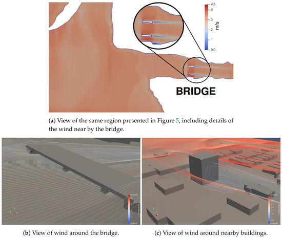 Figure 6 shows the resulting wind model for the proposed test scenario, including examples of wind models around the bridge and buildings.