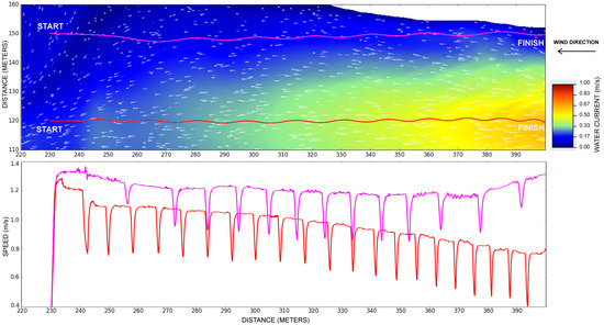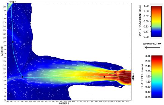 Figure 8 shows the boat starts at the right-hand side and goes to the top left side of the map. The boat has a higher speed when it is leaving the straight canal, where the water current is faster, and the speed decreases as the boat reaches the open waters on the left-hand side. The total traveled distance is 452.38 m. The boat took 376.98 s (average speed of 1.2 m/s with a peak speed of about 3.04 m/s) to complete the trajectory since it is running in the same direction of the water and wind flows, helping the boat to gain speed.