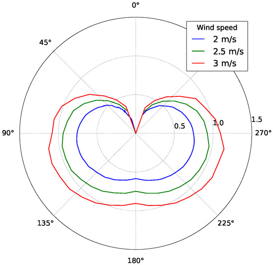 Figure 10, for a wind with angle 90° and speed of 2 m/s the maximum sailboat speed is about ≈0.75 m/s. This particular polar graph presented in