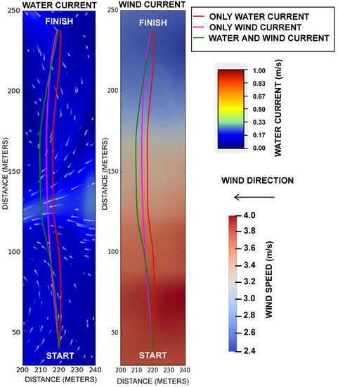 Section 5.2 show two different examples of how winds and water models can affect the trajectory of the boats.