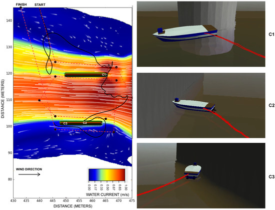 Figure 6, located at 30°02′50.5″ S 51°13′57.7″ W, in the city of Porto Alegre, Brazil, nearby the Dilúvio’s river mouth. In this figure we can see that the water current is faster in between the two pillars of the bridge, and the current is slower by the river banks. The differential boat started in the top position of the image and it has the goal of capturing images in the positions marked with dots. The black solid line represents the trajectory executed by the USV. The dashed line represents the expected trajectory. The points with C1, C2, and C3 marks show places of collision with the pillars, detailed in the screenshots.