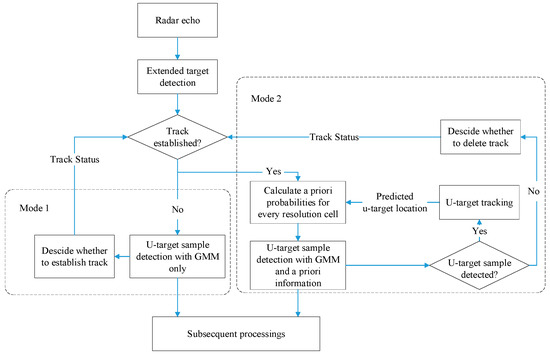 The GBD algorithm has two work modes, mode 1 is functional when the tracking of u-targets is not established. In this mode, only the GMM is used to detect samples of u-targets. Mode 2 is functional when the tracking of u-targets is established. In this mode, both GMM and a priori information are used. The establishment and deletion of tracks is designed according to a specific tracking scenario and is performed after the detection of all samples in every radar processing period.