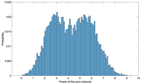Normalized histogram of the sum channel power of a sample which samples echoes of only one scattering center. The echo of the scattering center is generated by a bimodal distribution composed of two Gaussian components. The parameters set for Gaussian component 1 is and the parameter set for component 2 is .