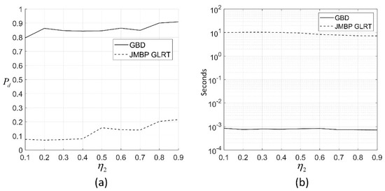(a) of the two algorithms for different with , , , and , , , where the of the two algorithms are calculated under the same false alarm rate ; (b) average computation time of the two algorithms for each with the same parameters set as (a); the algorithms are programmed by MATLAB on a PC with Intel Core i5-6300 CPU @ 2.4 GHz, 4 GB memory, and a Windows 10 operation system; interior-point algorithm is used to solve the maximum likelihood (ML) estimation in JMBP GLRT, with the initial search point being the true values of the target parameters.