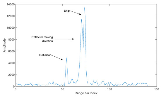 In this section, the performance of GBD is evaluated by field test measured data. The data collection experiment is shown in Figure 6. In the experiment, the radar was installed ashore, the ship was at anchor, and a small ship carrying a corner reflector moved from the position shown in the figure across the ship in range dimension. The distance between the corner reflector and the ship in azimuth dimension is approximately 50 m, corresponding to . When the reflector and some part of the ship are in the same range, a u-target is formed. The monopulse radar is in X band, and uses a linear frequency modulation (LFM) signal of 50 MHz bandwidth. During the experiment, the radar beam kept pointing at the ship. The range profiles of the ship and corner reflector produced by the radar are shown in Figure 7. It is obvious in Figure 7 that both the corner reflector and the ship occupy multiple range bins, but the JMBP GLRT is developed assuming that targets are within one range bin. Therefore, the assumption of JMBP GLRT cannot be satisfied and the algorithm is not suitable for the experiment. To provide a benchmark for evaluating the performance of GBD, instead of JMBP GLRT, GBD is compared with Blair GLRT [7], a typical algorithm applicable to the experiment and the very algorithm compared with JMBP GLRT in the literature [12].