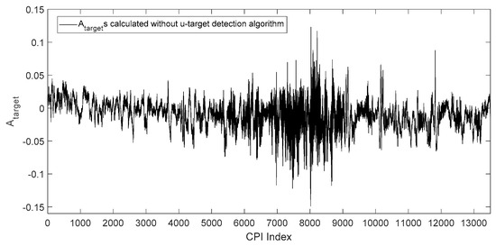 In which is the number of samples in the range profile of the target at time . The target angles of each CPI estimated by Equation (31) without using u-target detection algorithm is shown in Figure 8, in which the horizontal axis is the index of CPIs, corresponding to time, and the vertical axis is the of each CPI. In Figure 8, each angle estimate is calculated by all range profile samples of the CPI that the belongs to, which means no u-target samples is detected and removed before the is calculated.