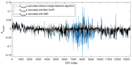 It can be clearly seen in the figure that during period CPI = 7000–9000, calculated with GBD has the smallest glint, and calculated with Blair GLRT has a medium-scale glint. As samples of u-targets cause a larger glint than samples of resolved targets, the curves in Figure 9 indicate that GBD correctly detected and removed more samples of unresolved targets than Blair GLRT, and reduced a more harmful effect of unresolved targets than Blair GLRT in angle estimation. To quantitatively evaluate the effect of GBD and Blair GLRT in radar angle estimation, we calculated the variance of angle estimations in typical time intervals shown in Table 2.
