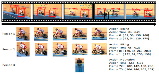 Recently, owing to the wide use of video-sharing sites, the production and consumption of video data have been rapidly increasing. Accordingly, studies are actively conducted to automatically analyze video contents and detect human actions contained in them. The video-based human-action-detection technology refers to (1) not only the estimation/classification of human actions contained in a video (action classification, AC) (2) but also the detection of temporal regions of a video containing the respective actions (temporal localization). Recently, as shown in Figure 1, (3) owing to the detection of a spatial region showing humans performing an action in a video (spatial localization), spatio-temporal human-action-detection technology, which enables the detection of actions of each person included in a video, has been gaining interest [1,2,3]. Such a human-action-detection technology can be used in various applications in both indoor and outdoor environments, e.g., video-based surveillance, security and search systems, VOD (Video On Demand) data management systems, artificial intelligence social robotic systems, and elderly care service systems.