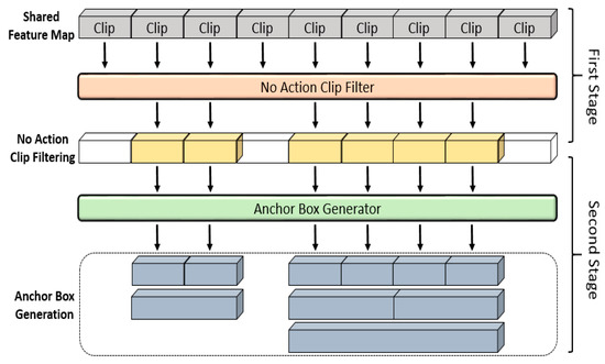 To solve this problem, similar to SSD and faster R-CNN techniques for 2D image-based object detection, efficient frameworks have been also proposed for detection within a 3D video-based action area, whereby action candidate boxes (anchor boxes) of various lengths are proposed from a video (temporal region proposal, TRP); based on these boxes action-classification is performed [1,35,36]. This method can detect a temporal boundary of each action effectively as it classifies fine-level actions bounded by the size of the anchor box. However, as the box size becomes increasingly diverse, the number of boxes to be generated increases considerably. Furthermore, when generating an anchor box, it could overlap with another anchor box generated earlier, and this could lead to the generation of an increasing number of boxes. When the number of anchor boxes increases, a region containing an action can be investigated in more detail but if the number is considerably high, action detection could be delayed. For the temporal-region-proposal process, this paper proposes an efficient framework that filters regions not containing any action according to the clip units before the generation of anchor boxes of a fixed length.