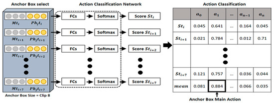 As the inputs of the AC network (ACN), the AC process of the proposed model uses the multimodal features learned earlier using the temporal regions of proposed anchor boxes and the pose information changed during a clip (Figure 6). As shown in Figure 6, the ACN consists of FCs and Softmax layers, which are last layers of the proposed model, and classification score is calculated for the action in each clip unit. For each action, the calculated score is compared with the action threshold (). When the score is larger than the threshold value, the action is determined to be a human action contained in the corresponding clip, and by obtaining the average of all the scores calculated for each clip region, an action represented in an anchor box is classified, as shown in Equation (1). In the video-action classification process, by using the previously learned multimodal features, the feature-learning time for AC can be reduced. Furthermore, as the multimodal features and the detected human pose features are used simultaneously, the context information of adjacent images and the changing human joint trajectory information can be used simultaneously.