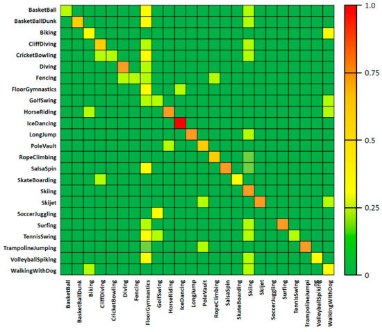 In the fifth experiment, a confusion matrix table of AC was used to conduct the AC performance test, as shown in Figure 7. In this table, the correlation between action classes can be confirmed for the UCF-101 dataset, and the results are consistent with those in Table 1. When using the action-class videos on the left side as inputs and calculating the score for each action through the AC process, the estimated action scores are shown for the respective action classes at the bottom of Figure 7. The right side of Figure 7 shows the degree of AC in color. Most classes have a classification accuracy that matches the action label. However, in the case of “SoccerJuggling” or “GolfSwing”, the fine-level feature information could not be actively used because the locations where the actions occurred were very similar, and at the same time, human detection was missed frequently in the process of learning the fine-level features.