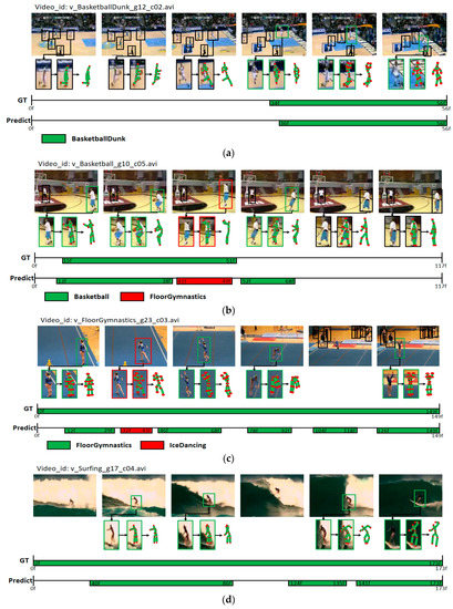 Figure 8 illustrates the visualization of real results for the detection of actions in videos by using the proposed model. Figure 8a,b show the classification of two actions “BasketBallDunk” and “BasketBall” by using the pose information of the two actions occurring on a basketball court. Moreover, in Figure 8a, as the classification was performed properly until the time boundary that the action had occurred, high accuracy of action detection performance was confirmed. In Figure 8b, in the middle of the action detection result, the action was classified incorrectly as “FloorGymnastics”; this is an example for incorrect classification of an action because of confusion with the action in Figure 8c. In both cases (Figure 8b,c), the motions of raising both arms are shown. In the case of Figure 8c, the human detection was missed at the end of the video when the person turned around in the process of jumping. If the number of missed human detections increases, the spatio-temporal action-detection performance could decrease. In Figure 8d, the detected human pose information is not consistent with the real pose of a human in the image; this shows a good example of performing correct video-based action detection by using the surrounding background or object information, whereby the AC is performed using the visual features.