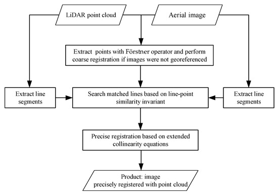 The flow chart of automatic registration of urban aerial images with LiDAR points based on the line-point similarity invariant and extended collinearity equations.