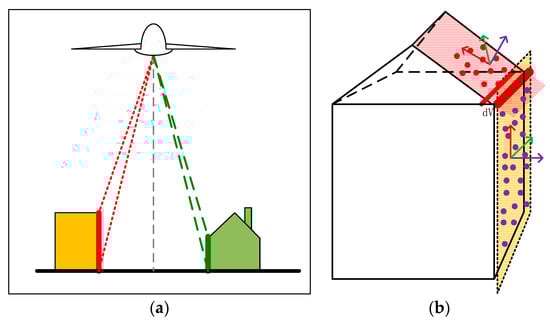 Line features extraction based on LiDAR point clouds: (a) LiDAR point clouds echoed from the wall; (b) the small cuboid formed by moving the wall or the roof plane along its normal direction.
