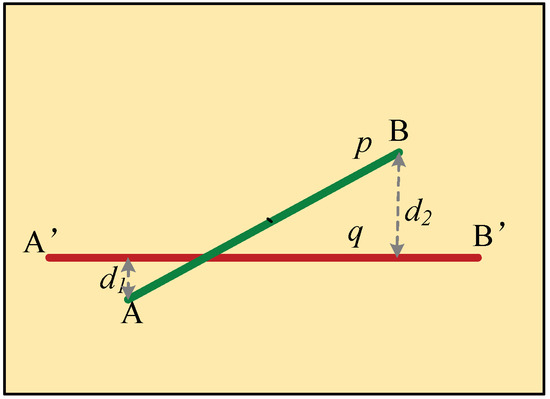 - Lines matched by step (2) may lack robustness. The right part of Figure 4 demonstrates this more clearly: both line pairs , and , meet the requirement of the line-point similarity invariant, but neither nor is matched to line . To overcome this problem, the distance between the two lines is introduced as an auxiliary similarity measure. This definition was illustrated by Figure 6, where A, B are the end points of line , and the distances from points A and B to the line are denoted by and , respectively. The distance from and is then defined by Equation (11). If is greater than two times the average distance of laser points, then line p is labeled as not matching with line .