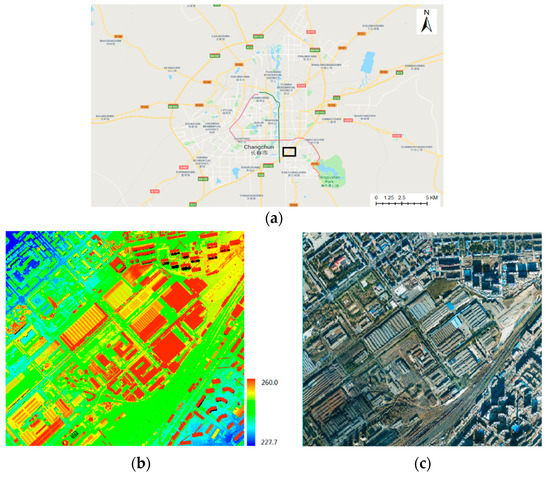 Experimental data: (a) location map of experimental area (b) LiDAR point clouds and (c) aerial optical image.