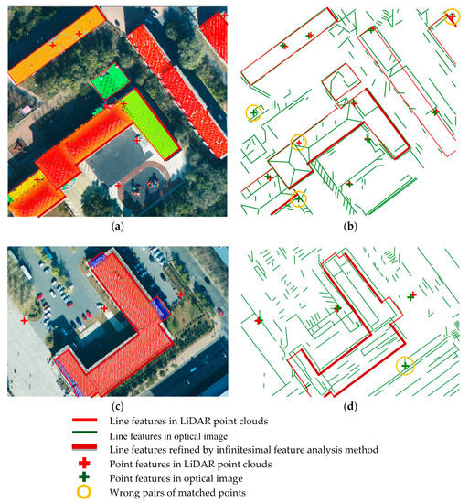 Extracted lines and points: (a) and (b) show the features extracted from LiDAR data; while (c) and (d) show the features extracted from optical images.
