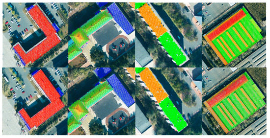 In the first step of the proposed method, coarse registration is performed by DLT. The DLT parameters were calculated by matched points extracted by the Förstner operator from both the image and LiDAR data, followed by the extraction of line segments (Figure 8). It is found that there are plenty of line segments distributed uniformly in the point cloud, and each line is surrounded by a certain number of matched points; thus, the condition of the line-point similarity invariant is satisfied. Though the aerial image has been coarsely registered, some roof surfaces are still obviously shifted from their true positions (shown in the top row of Figure 9), indicating that precise registration is necessary.