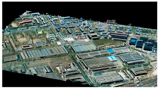 A method for quantitative registration accuracy evaluation was also proposed: line segments were firstly sketched manually both in the point cloud and the optical image, respectively, and line segments in the image were then mapped onto the point cloud by collinearity equations. Formula (11) was finally applied to calculate the distance between a line segment in the point cloud and the corresponding one mapped from the image. A smaller distance indicates a more precise registration. In our experiment, forty-nine such line segments were manually selected. They were independent from the observed ones used for the establishment of the registration model and had different directions. Statistics of maximum error (MAX), mean error (MEAN), and root mean square error (RMSE), of the distances between the forty-nine pairs of line segments were used for the accuracy evaluation. Table 1 shows that after coarse registration, the MAX, MEAN, and RMSE are 1.52 m, 0.61 m, and 0.45 m, respectively. They decrease to 0.52 m, 0.24 m, and 0.13 m, respectively, after precise registration. Considering that the average LiDAR point distance is about 0.7 m, and that the ground resolution of the optical image is about 0.14 m, we conclude that the proposed registration method is effective and precise. Figure 10 shows a 3D perspective view of the colorized LiDAR point clouds in the low-density urban setting of Changchun, generated with the registered image and LiDAR data. Although both the image resolution and point density are low, the high quality of registration is readily ascertained through the buildings, trees, and other objects shown in the scene.