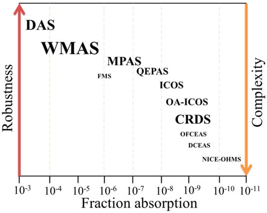 Different gas detection techniques are compared in terms of the sensitivity, complexity, and robustness of the sensor. The font sizes stand for their current importance for trace gases detection. DAS: direct absorption spectroscopy, WMAS: wavelength modulation absorption spectroscopy, MPAS: multi-pass absorption spectroscopy, FMS: frequency modulation spectroscopy, ICOS: integrated cavity output spectroscopy, OA-ICOS: off-integrated cavity output spectroscopy axis, CRDS: cavity ring-down spectroscopy, OFCEAS: optical-feedback cavity-enhanced absorption spectroscopy, DCEAS: direct cavity-enhanced absorption spectroscopy and NICE-OHMS: noise-immune cavity-enhanced optical heterodyne molecular spectroscopy.