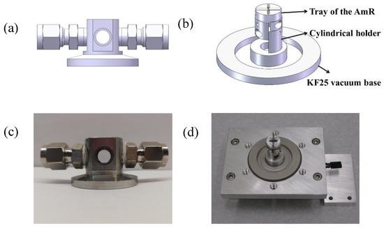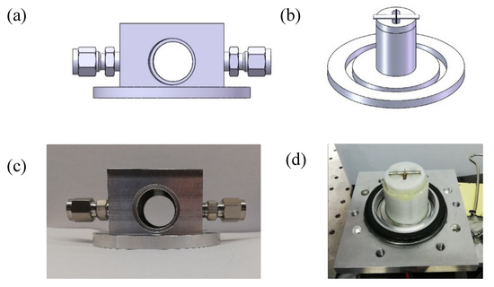 A custom QTF-based ADM was designed following the structure of the standard QTF-based ADM for laboratory applications described in Section 3.2 in order to accommodate these large size custom QTFs and the AmR tubes. A vacuum cap was designed to provide a high vacuum, as shown in Figure 7a. The vacuum cap had a cuboid main body with dimensions of 57 × 57 × 35 mm3 and a KF40 vacuum interface. A cylinder space with a 42-mm diameter and a 38-mm height was provided inside the cuboid main body to accommodate the spectrophone. Two windows with a diameter of 25.6 mm were vertically glued to the front and back of the cap with a 5° angle with respect to two mounting surfaces, avoiding rotation of the cap during the assembly process. A gas inlet and outlet were equipped on the left- and right-hand sides of the cap to enable gas exchange inside the ADM. A KF40 vacuum base was employed as the counterpart of the KF40 cap as shown in Figure 7b. A hollow cylinder as a spectrophone holder was fabricated by means of 3D printing technology and glued onto the KF40 vacuum base in order to place and position the AmR tubes. Stainless steel was used for the custom QTF-based ADM. The photos of the KF40 vacuum cap and base are shown in Figure 7c,d, respectively.