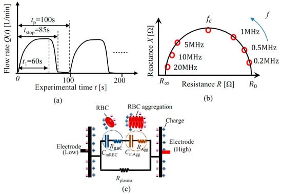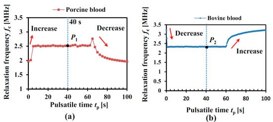 Figure 5a illustrates the relaxation frequency fc of porcine blood under pulsatile flow rate Q(t). The fc is obtained by the multiple-frequency electrical impedance spectroscopy and the Nyquist-plot introduced in Section 2. Hence, fc is also called the multiple-frequency parameter. It is seen that, at the beginning, the fc of porcine blood (red point) is around fc = 1.96 MHz, and it increases quickly in the case that the flow rate Q(t) is increasing. Then, the fc of porcine blood remains almost stable around fc = 2.51 MHz until a gradual decrease is seen after the time tp = 60 s. However, the fc of bovine blood shows the opposite trend, seen in Figure 5b, it falls down sharply with the flow rate Q(t) from fc = 3.22 MHz to fc = 2.33 MHz, and then increases gradually in the case that the flow rate is stopped after the time tp = 60 s. From the variation of fc, the behavior of porcine blood and bovine blood is quite different: one increases with flow rate, whereas the other one decreases. As mentioned above, the RBCs of porcine blood quite easily form the RBCs aggregates (“rouleaux”), whereas the RBCs of bovine blood do not. Here, the difference of fc is thought to be caused by the RBC aggregation, which means that the RBC aggregation can be quantitatively investigated by fc.