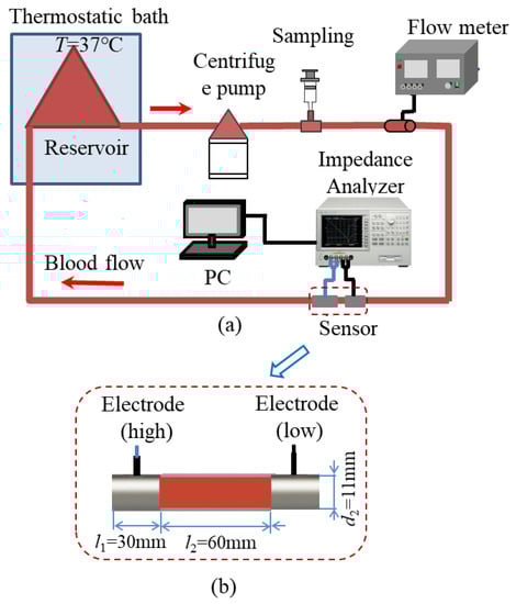 Figure 2a shows the blood circulation system for the RBC aggregation experiments. A blood reservoir (Senko Medical Instrument Mfg. Co., Ltd., Kasukabe, Japan) is utilized to store the fresh blood, and it is kept inside a thermostatic bath at T = 37 ℃. A centrifugal pump (HCF-MP23, Mara, Kasukabe, Japan) is used to make the blood flow inside the blood tube. Different flow rates are obtained by controlling the rotation speed of the centrifugal pump. The flow rate is measured by a flow meter (T106, Transonic Systems Inc., Newyork, NY, USA). Two stainless steel rings with the length of l1 = 30 mm are applied as the sensor to measure the impedance of blood, and their sizes are illustrated in Figure 2b. The impedance signal is then obtained by an IM7581 impedance analyzer (Hoiki Company, Nagano, Japan) and analyzed by the personal computer (PC). The internal diameter of the blood tube used is around d1 = 9.5 mm, and the external diameter is around d2 = 11 mm. All of the blood tube and reservoir are coated with heparin to avoid coagulation.