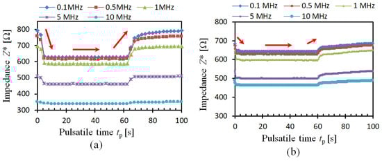 Previous electrical impedance spectroscopy studies on RBC aggregation measurements are all based on impedance/conductivity, which is frequency-dependent and not sufficient to distinguish the influence of RBC aggregation and blood flow factors (RBC orientation, deformation, thickness of EDL). Figure 3a illustrates the impedance performance of porcine blood with pulsatile flow during the experiments. It is observed that the impedance of porcine blood Z*(t) changes with the measurement frequency. In the case that the frequency is f = 0.1 MHz, at the beginning, the impedance of porcine blood Z*(t) is around Z0*(t) = 790.4 Ω. Then, the impedance of porcine blood Z*(t) decreases as flow rate Q(t) increases, and then the impedance remains almost constant around Zs*(t) = 626.4 Ω. In the case that the flow rate Q(t) falls after the time tp = 60 s, the impedance of porcine blood Z*(t) goes up gradually to the original value Z0*(t) = 790.4 Ω. The impedance change shows the pulsatile regular pattern, which is thought to be caused by the pulsatile flow rate. Additionally, the impedance Z*(t) of porcine blood under different frequencies shows the same trend of variation, however, the rate of decrease of the impedance Z*(t) is becoming smaller in the case that frequency is higher. In the case that the frequency is f > 10 MHz, the decreasing and increasing variation are difficult to observe.