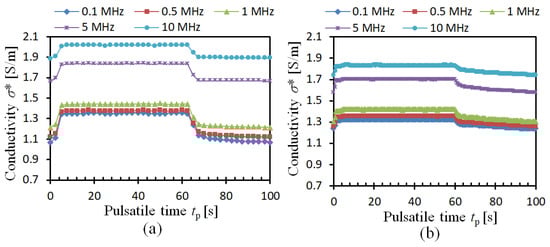 Figure 4a illustrates the conductivity change of porcine blood under pulsatile flow. Different from the impedance performance, the conductivity σ* of porcine blood increases with the flow rate Q(t). In the case that f = 0.1 MHz, the conductivity σ* of porcine blood is σ* = 1.07 S/m. It goes up to σ* = 1.35 S/m, in the case that Q(t) is increasing. In the case that Q(t) decreases to zero, the σ* falls down to the original value as well. The same trend is also found in bovine blood, which is shown in Figure 4b. It is obvious that the σ* of both porcine blood and bovine blood are affected by the frequency and flow rate, which brings the difficulties to identify the RBC aggregation in these blood samples. It means that a much more effective parameter should be found to easily evaluate RBC aggregation.