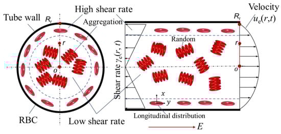 In this study, pulsatile flow is applied to separate the RBC aggregates, which means that the flow rate Q(t) changes with time (shown in Figure 1). Additionally, according to the theory of Poiseuille flow, the shear rate distribution of flow inside the tube is inhomogeneous, as is shown in Figure 6. Therefore, the shear rate γe(r, t) is a function of the radial distance r and the time t. In order to quantitatively calcuate the influence of RBC aggregation, firstly, the velcocity ue(r, t) of blood flow inside the tube with circular cross section under the condition of pulsatile pressure gradient is obatained by the following equation [35]: