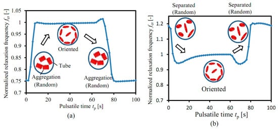 Figure 7 illustrates the calculation results of the influence of RBC aggregation on the fc of blood based on the modified Hanai equation. It is seen in Figure 7a that, at the beginning, the flow rate Q(t) of porcine blood inside the tube is quite small, and so is the shear rate γe(r, t). Hence, the RBCs quite easily form RBC aggregates. Here, to simplify the calculation, we assume that all of the RBCs are aggregated as the “rouleaux” structure, which is treated as a big particle with the same diameters Dy and Dz as a single RBC, and only the diameter in the x direction Dx changes. Moreover, the orientation of the RBC aggregation is random, so the the deformation and the thickness of RBCs remains stable. Then, with the increasing flow rate Q(t), the shear rate γe(r, t) shows an inhomogeneous distribution. In the high shear rate region, the high shear rate separates the RBC aggregations into single RBCs. Additionally, the separated RBCs are oriented along the longitudinal direction, and their shape and thickness are deformed by the generated shear force. The normalized relaxation frequecy fcr of porcine blood goes up quickly from fcr = 0.75. After that, the normalized relaxation frequency fcr keeps around fcr = 1 in the case that all of the “rouleaux” aggregations of RBCs are separated and all of the RBCs are oriented. In the case that the pusatile time tp > 60 s, the flow rate Q(t) is stopped, the shear rate γe(r, t) becomes smaller, and then, the RBCs gather together again to form a “rouleaux” aggregation, and their shape and the thickness of the electrical double layer are restored to the orginal value. Therefore, the normalized relaxation frequency fcr falls quickly from fcr = 1 to fcr = 0.75.