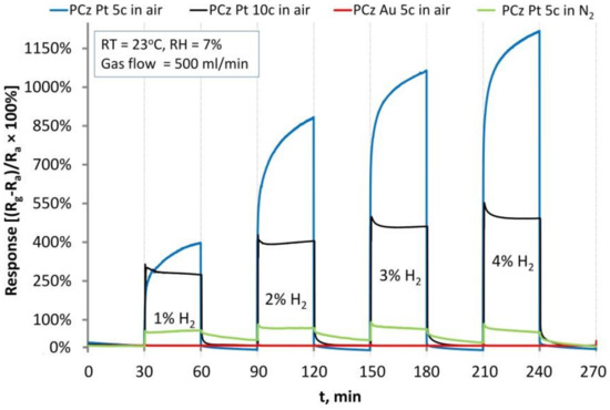 The PCz film deposited on IDE-Au showed no response to hydrogen gas (Figure 2, red line). When PCz was deposited on IDE-Pt, a very strong response (electrical resistance increase) to the presence of hydrogen was observed.