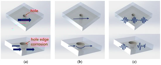 Illustration of changes for Lamb waves passing through a hole-edge corrosion. (a) Signal maximum amplitudes, (b) Signal phase, and (c) Signal time series.