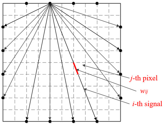 As shown in Figure 3, there are a total of M signals that are to be projected and scanned for the reconstructed image. is used to represent the projection value of the i-th (1 ≤ i ≤ M) signal, that is, the line integral value of the ray along the ray path on the image to be built. The length of the i-th signal scanned on the j-th pixel grid, that is, the weight factor, is represented by .
