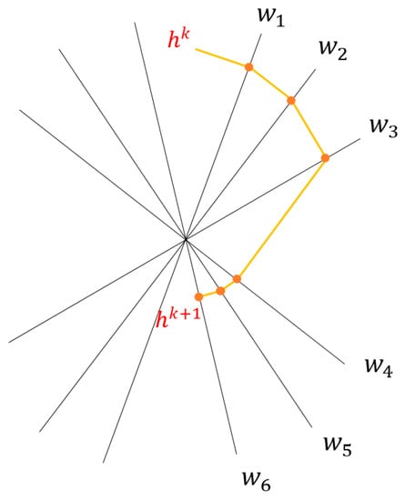 where k is the number of iterations, expresses the value of the vector h when the i-th equation participates in the calculation at the k-th iteration and is the relaxation factor, which the general value is 0~2. Figure 4 shows an example of one iteration for the consistent case with the relaxation parameter .