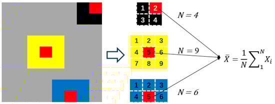After getting the initial matrix, we need to process the matrix to get the detail image. Since each specific sensor path is affected by its path, the final result is obtained. To better simulate this process in final reconstructed discretization sampling results, a homogeneous simulation method was used to construct new images using the original images. The dimension of the new image is the same as the original image, but the value in each grid is the average of the values of all adjacent grids of the grid corresponding to the corresponding positions in the original image. When the pixel grid is located at the four corners of the monitoring area, the pixel value of the grid is an average of four grid pixels; when the pixel grid is located at the edge of the monitoring area, the pixel value of the grid is an average of the adjacent six grids; when the pixel grid is located at the other positions, the pixel value of the grid is the average of the surrounding nine grids. The schematic diagram is shown in Figure 5. The results of homogenization method can be seen in Figure 6.