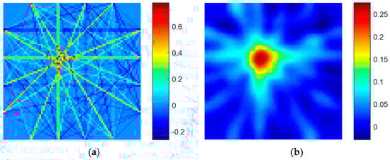 For the acquired signals, the ART algorithm is used. When the ART algorithm is applied, the monitoring area of the entire aluminum alloy plate is discretized. The reconstructed image is composed of square non-overlapping pixel grids. Each side of the square has a side length of 1, and the pixel value of the j-th pixel grid is represented by .