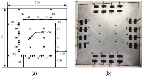 (a) The diagram of the layout of the piezoelectric sensor network and (b) the real layout of piezoelectric sensor network (unit: mm).