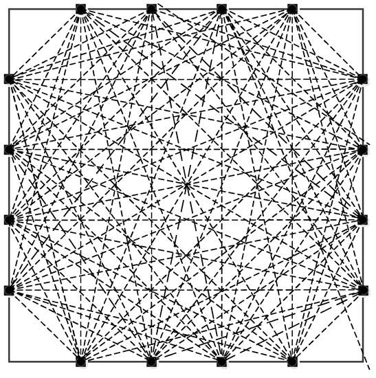 The diagram of the layout of the piezoelectric sensors on the tested structure is shown in Figure 8, the thickness is 2 mm. 16 piezoelectric sensors are arranged on the structure, and 96 effective sensing paths was achieved (shown in Figure 9). The related studies have shown that the layout method is more effective for thickness variation damage.