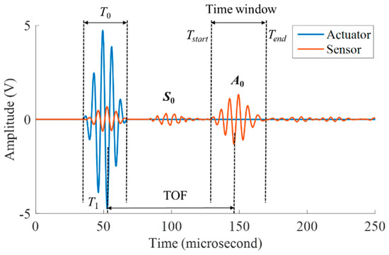 Time of flight (ToF), defined as the time consumed for a wavepacket to travel a certain distance, is one of the most straightforward features of a wave signal [39]. The diagram of ToF in this article is shown in Figure 10. Choosing an odd frequency is good for finding the peak value of the signal and making it easier to find the ToF (time of flight), so it is usually 3 or 5 cycles. For a tone-burst excitation with certain count number , the higher the frequency, the shorter the time duration, and hence the wider the spectral spreading. To maintain the concentrate of the tone burst energy in a tight frequency band, when the frequency is reach 200-kHz, 5-cycle tone burst count was chosen instead of 3-cycle.