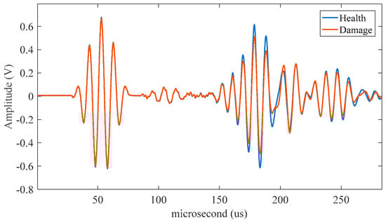Health and damage signals were collected by SMART PZT device before and after corrosion. Each group of signals are collected three times to get the average value to eliminate the error caused by human error and the external environment in the test process. Figure 11 is the health signal and damage signal of the sensor path passing through the hole-edge corrosion damage. After collecting 96 paths of health signals and corrosive damage signals, the normalized amplitude is extracted as the characteristic parameter according to Section 2.2 analysis. ART algorithm was used to image, and then homogenization processing is carried out to obtain the final damage image.