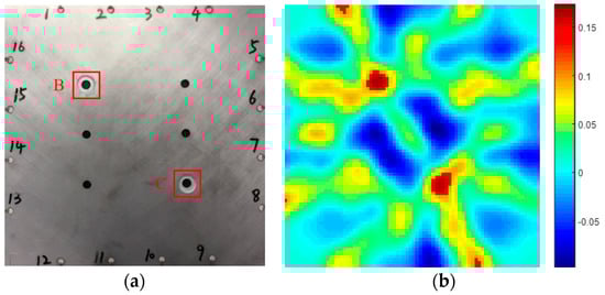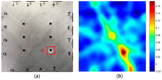 Figure 14 shows the real and predicted corrosion damage of two holes. As shown in Table 4, in Figure 14b, where the pixel value is greater than 0.15, it is identified as a corrosion damage area. For the calculation, the single hole corrosion damage area predicted by the corrosion holes in the upper left corner is 329.31 . The true single hole corrosion damage area is 273.06 . The percentage error between the predicted single hole corrosion area and the true single hole corrosion damage area is 20.60%. The single hole corrosion damage area predicted by the corrosion hole in the lower right corner is 357.44 . The true single hole corrosion damage area is 273.06 . The percentage error between the predicted single hole corrosion area and the true single hole corrosion damage area is 25.75%. Thus for double-hole-edge corrosion monitoring under the same conditions, the considerable light leakage was observed owing to the excessive edge reflection caused by the existence of another hole. However, in spite of the light leakage, the position and size of corrosion spots were still able to be predicted. The results indicated that the Lamb-wave-based tomographic method can be used to monitor the multi-hole corrosion damage accurately.