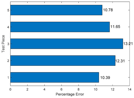 As can be seen from the Figure 12a,b, the pixel value in the image is closely consistent with the position of the etching hole. In order to demonstrate the effectiveness of the method for monitoring corrosion damage of porous aluminium alloy structures proposed in this paper, the experimental prediction results are compared with the actual corrosion damage results. For the quantification of its area, the percentage error refers to the error between the predicted damage and the real damage. The percentage error was calculated by applying the following equation: