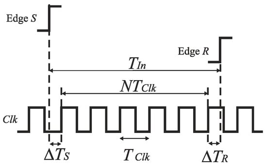 An early technique for a direct time digitization was based simply on counting a number of high frequency clock cycles TClk during an input time interval TIn defined by the edges (S and R) of a binary signal (Figure 2) [,]. The conversion time of the counter-based TDCs equals zero. The quantization noise introduced by the clock in such TDC is higher by 3 dB than in conventional ADCs if the start of the input time interval (edge S in Figure 2) is not synchronized with the reference clock []. The quantization step of the counter-based TDC is defined by the clock frequency (e.g., a time resolution 1 ns needs a clock frequency 1 GHz). The increase of the time resolution requires a higher frequency clock, and thus an increase of power consumption. On the other hand, the design of high-performance, high-frequency oscillators is limited by properties of submicron CMOS technologies [].