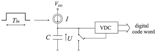 The other early approach to the time-to-digital conversion consists in a translation of the input time interval TIn to a corresponding voltage value, which is subsequently digitized by a classical voltage-to-digital converter (VDC) (Figure 3). First, a capacitor C is charged by a current source I during the time interval TIn. Next, the voltage U on the capacitor is converted by the VDC to the digital word. The conversion accuracy depends on the linearity of time-to-voltage translation and the resolution of VDC [,]. The disadvantage of this technique is a relatively high-power consumption and a need to perform the voltage-to-digital conversion which increases a TDC conversion time and becomes more difficult in low voltage applications.