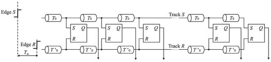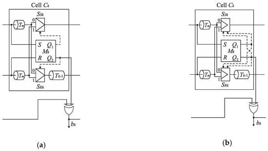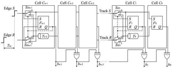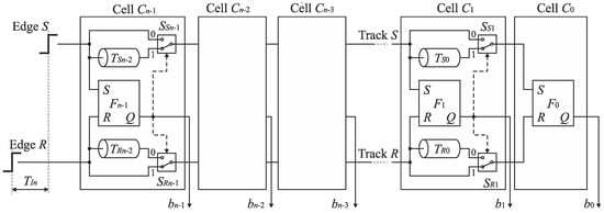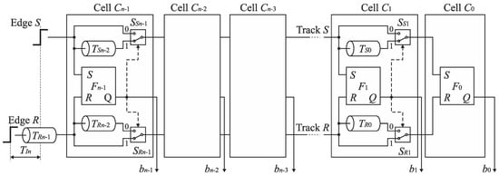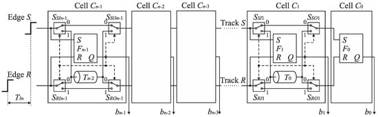 Therefore, the cells Cn−1, …, C1 can be equipped only with a single delay line included in track S or R at the price of a little extension of control logic []. Figure 15b shows the SA-TDC with the delay lines located in the track R. If the edge S precedes the edge R at the input of the cell Ck, then it has to be guided to the delay line located in the track R. For this purpose, each cell Cn−1, …, C1 must be equipped with an extra pair of switches SSIn−1, SRIn−1, …, SSI1, SRI1 (Figure 16) in order to guide a front edge (S or R) to a single delay line located in one of tracks (in track R in Figure 16). A role of the output pair of switches SSOn−1, SROn−1, …, SSO1, SRO1 is to restore an original track for the propagated edges before they enter the inputs of the next cell.