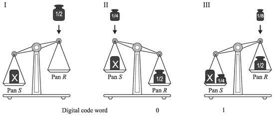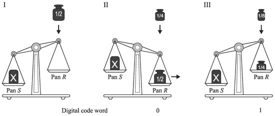 The monotone successive approximation is a subtraction-free algorithm []. Its operation is illustrated also by the use of analogy of weighting process (Figure 8). In the first step, the weight corresponding to the half of the full scale is added on the pan R which is opposite to that where the unknown mass X has been put (S).